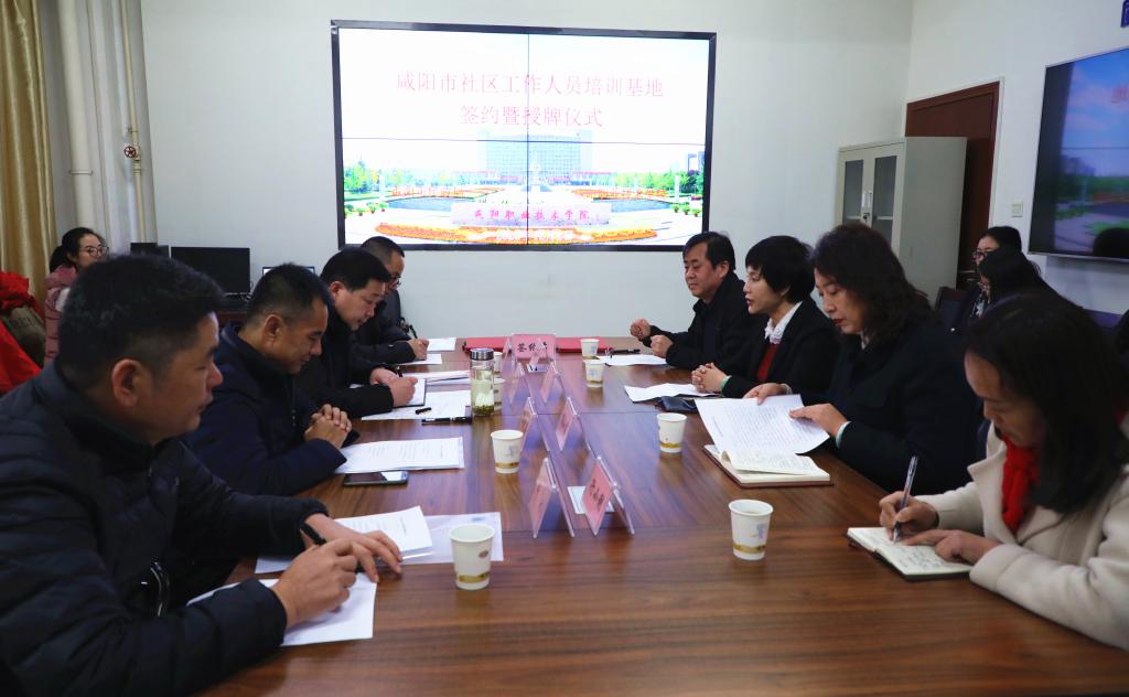 刘旭与芮红亚签署政校战略合作框架协议,并授予bst365“咸阳市社区工作人员培训基地”授牌仪式。