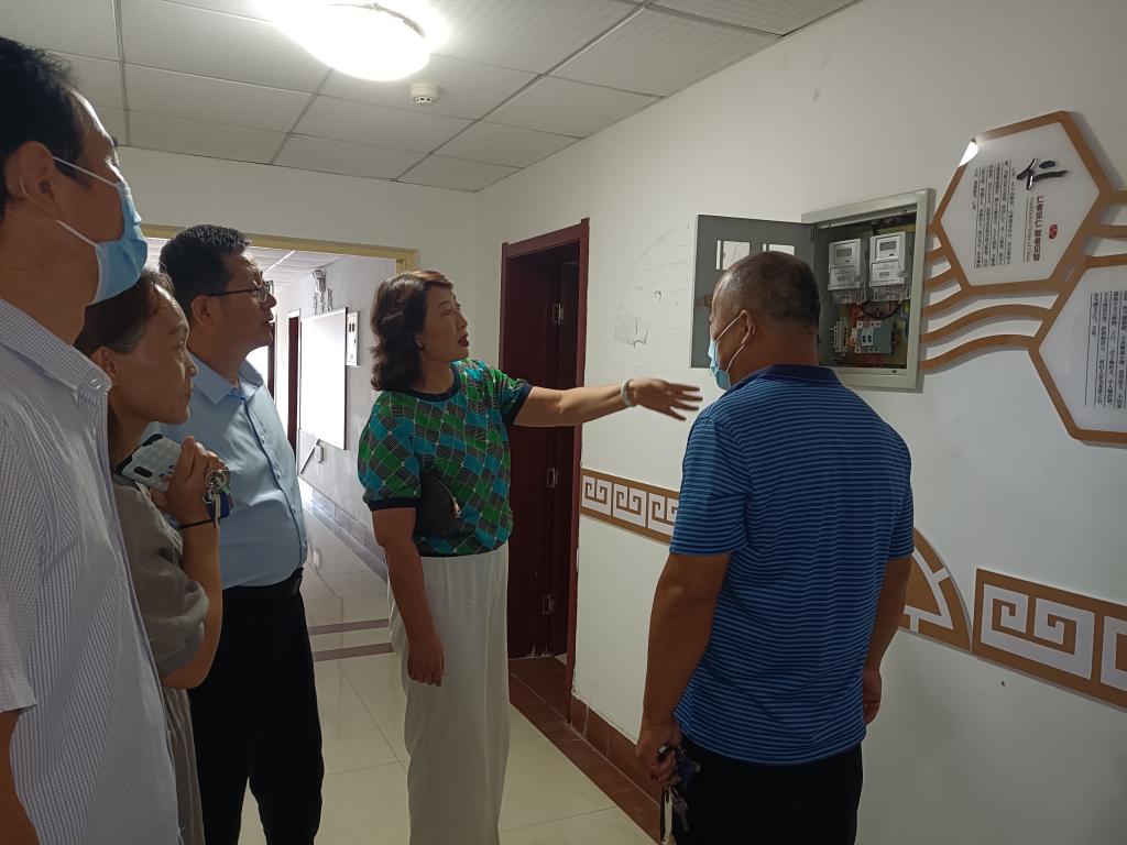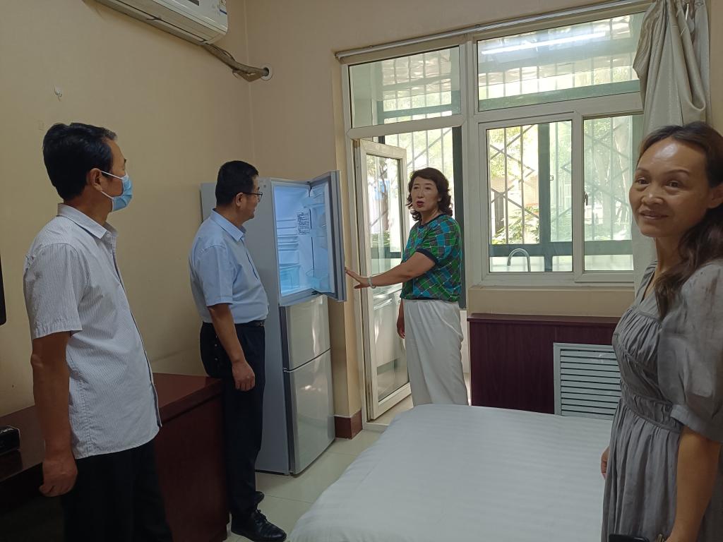 在公司招待所,冯小菊等班子成员仔细检查电源器件安全状况,详细了解房间水电设施使用情况,指导解决墙体文化松动脱落等问题。
