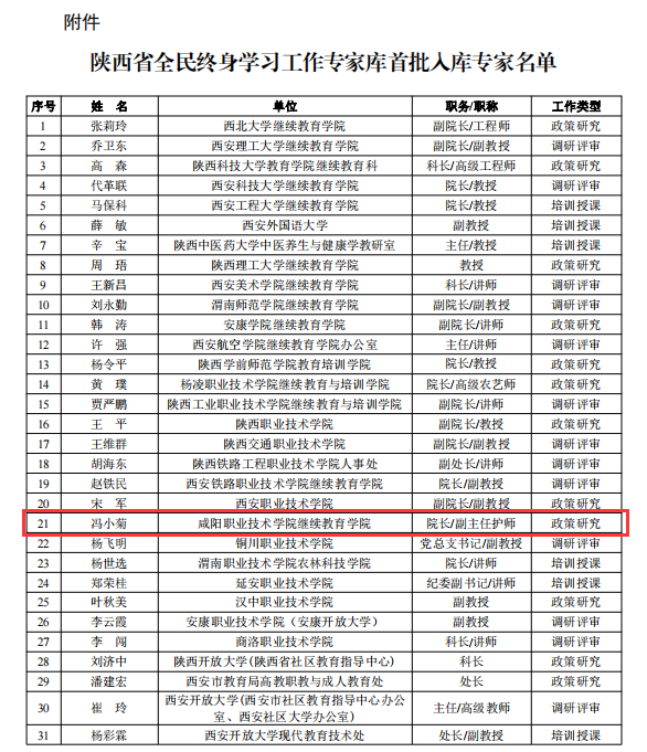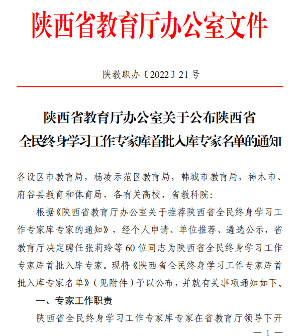 近日,陕西省教育厅办公室公布陕西省全民终身学习工作专家库首批入库专家名单,bst365bst365经理冯小菊成功入选全民终身学习工作专家库首批入库专家。