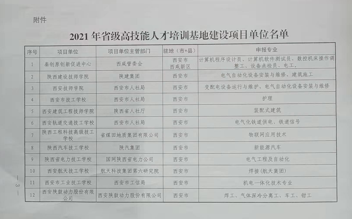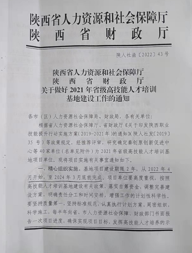 近日,陕西省人力资源和社会保障厅、财政厅联合发文《关于做好2021年省级高技能人才培训基地建设工作的通知》(陕人社函〔2022〕43号),bst365被确立为2021年省级高技能人才培训基地建设项目单位。