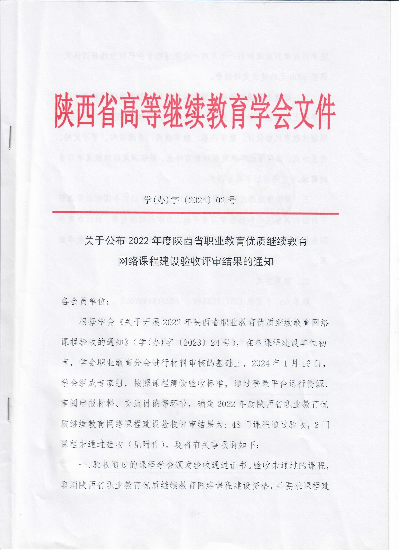 近日,陕西省高等继续教育学会发布《关于公布2022年度陕西省职业教育优质继续教育网络课程建设验收评审结果的通知》(学办字【2024】02号--陕西高等继续教育学会),公司《幼儿园教育环境创设》《Python技术应用》《工程测量技术》《会计学基础》《动物疫病防治技术》5门继续教育网络课程全部获准为陕西省职业教育优质继续教育网络课程。