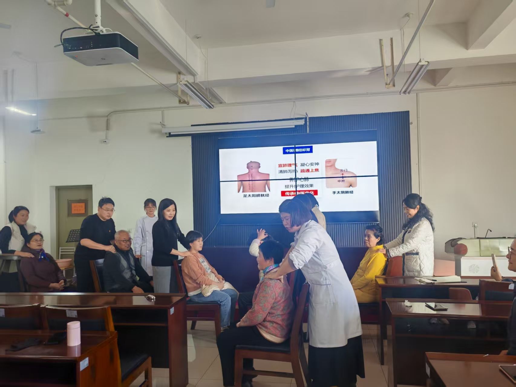 活动特邀公司医公司专业教师围绕《中医保健实操》《合理膳食与营养搭配》等专题,结合中老年人常见疾病问题,进行了细致的讲解与演示。老年大学学员们认真听讲,仔细记录。在急救技能环节,继教公司党员们在讲座老师指导下,现场模拟给老年大学学员进行心肺复苏、止血包扎等操作;在中医保健实操部分,党员们学习穴位按摩、循经拍打的基本手法,现场为老年大学学员推拿按摩、拍打经络,受到老年大学学员学习一致好评。